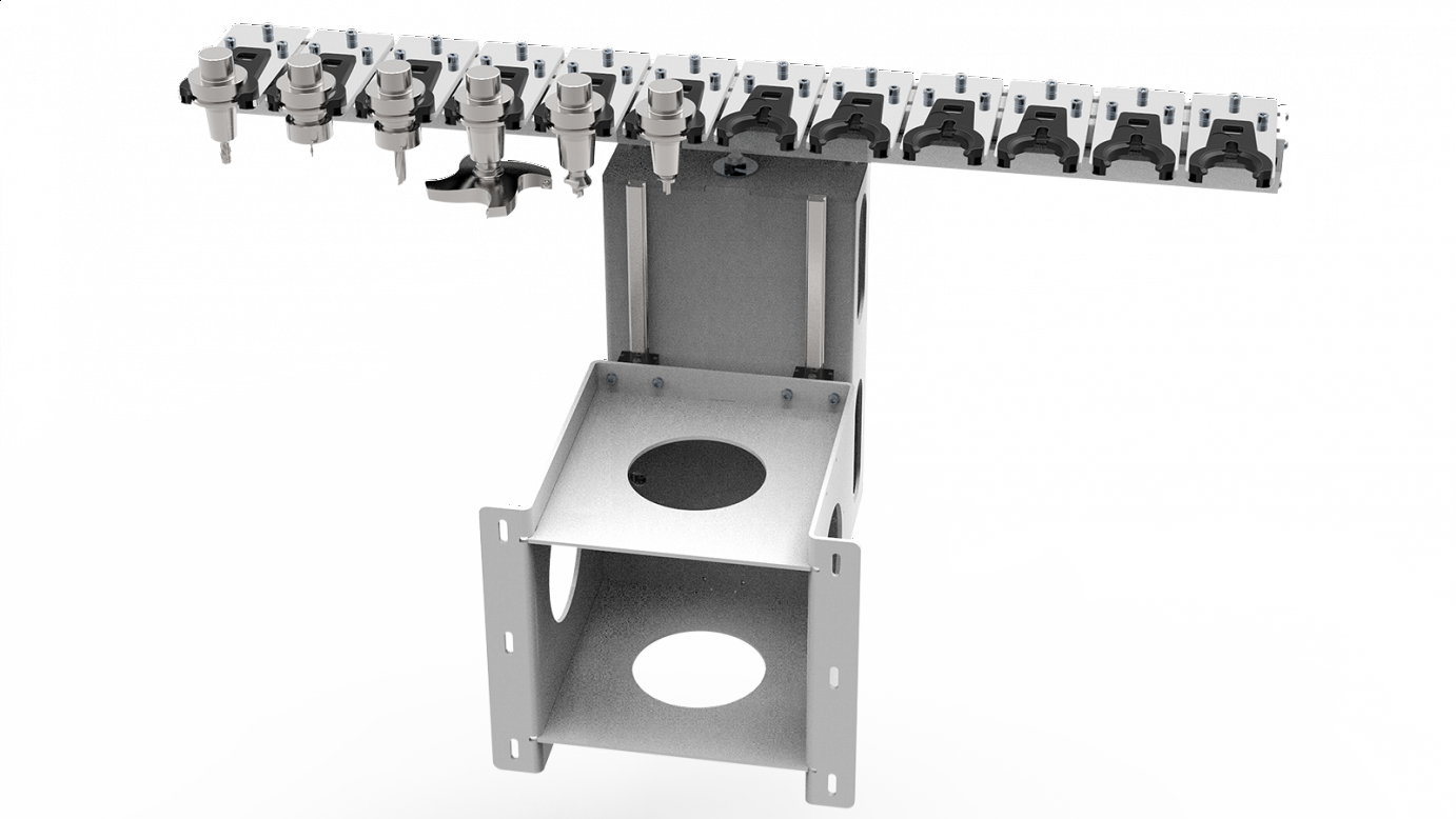 Cambiador de ùtiles de 14 posiciones en la estructa de la máquina Opcional: Segundo cambiador de ùtiles de 14 posiciones Opcional: Cambiador de disco de 18 posiciones móvil (recogida en posición) Opcional: Cambiador de hoja de sierra móvil con cubierta de herramientas |